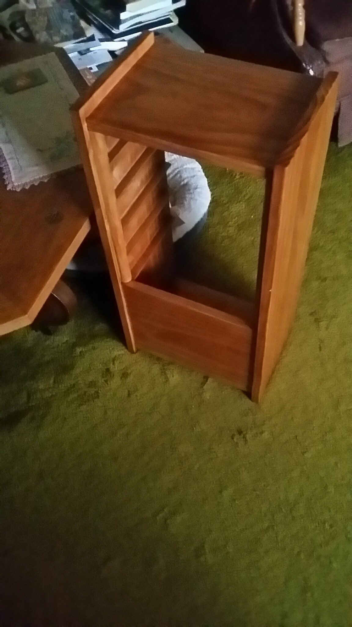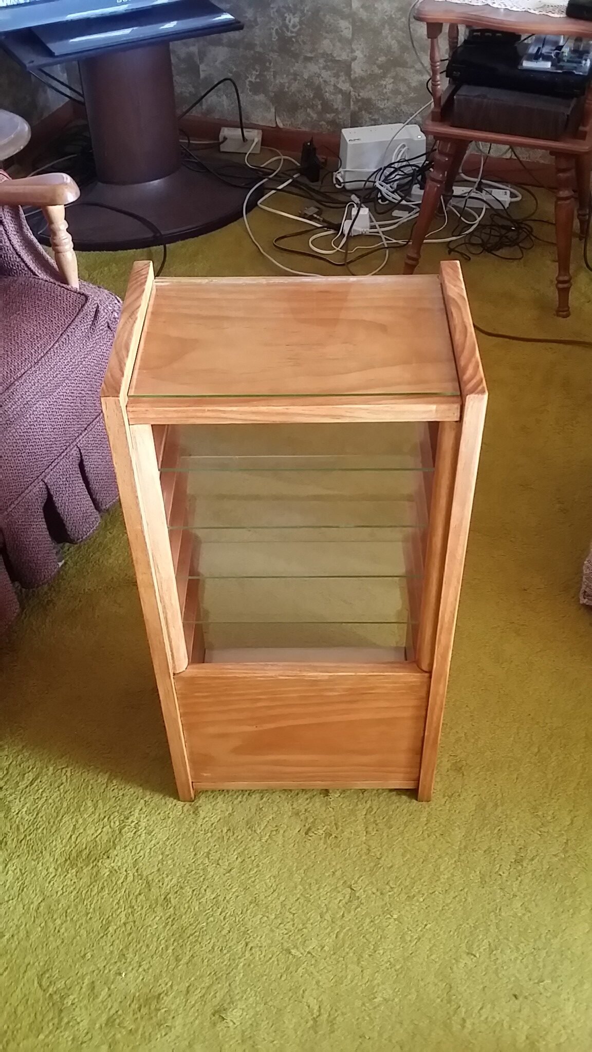 After accumulating a bunch of small electronic devices, I looked for an enclosure for these that would keep them off the floor, while still operating. In particular, I wanted an enclosure that would not catch fire should any of the small devices malfunction and overheat. Failing to find anything suitable at commercial sites, I decided to make one myself. The shelves are of glass, and were made from recycled panes of greenhouse glass. The bottom front wood panel adds stiffness to the cabinet and conceals a small UPS.